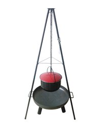 Stabiles Dreibein zum Kochen oder Grillen, mit Grillaufsatz und Kessel mit Deckel.